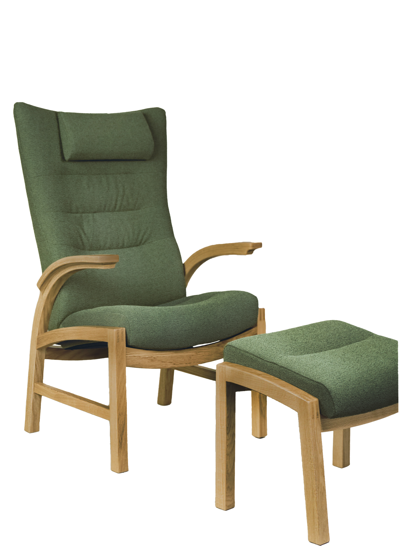 Lænestol med skammel, model Cantate 6011, med stel i natur eg og polster i bæredygtigt støvet blåt tekstil, stående foran stort vinduesparti og væg med egetræslameller